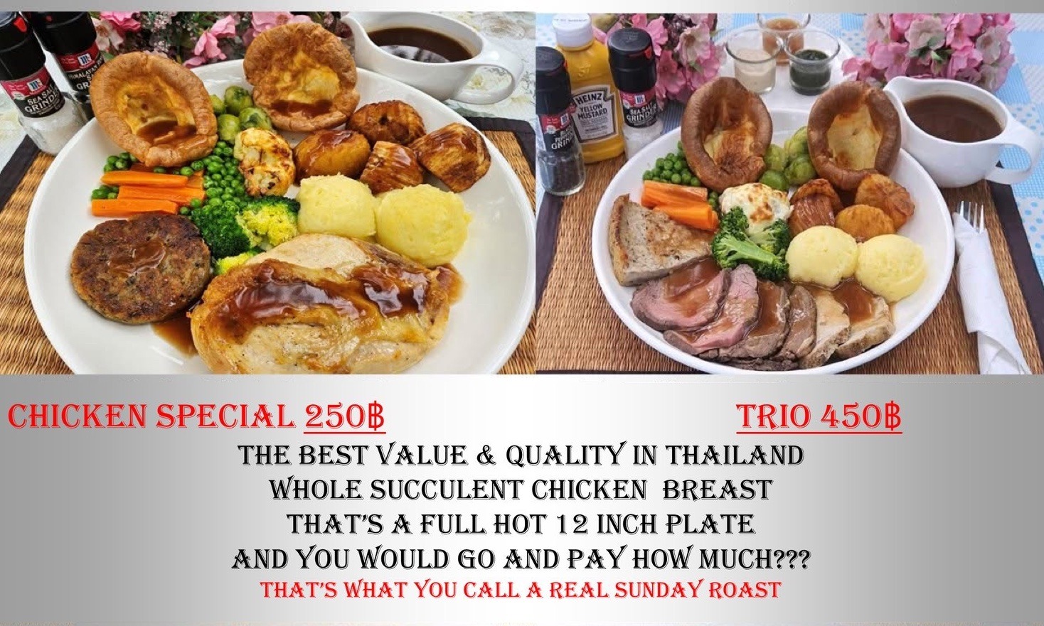 HARRY’S Chicken Sunday Roast Special is the best quality and value in Thailand at only 250 Baht. We also serve Beef, Lamb, and Pork English Roasts. HARRY’S Trio Sunday Roast, delivers the ultimate experience in a traditional Sunday Roast, you won’t find better anywhere in Thailand at only 450 Baht. You’ve tried the rest, now…